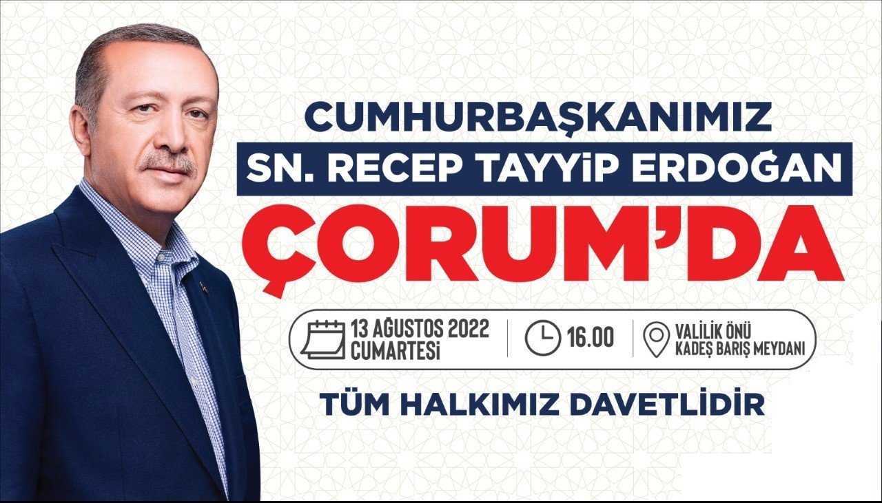 Cumhurbaşkanımız Sayın Recep Tayyip ERDOĞAN 13.08.2022 CUMARTESİ günü, toplu açılışlar, temel atma programı ile birlikte Çorum halkına seslenecektir. Tüm halkımız davetlidir.